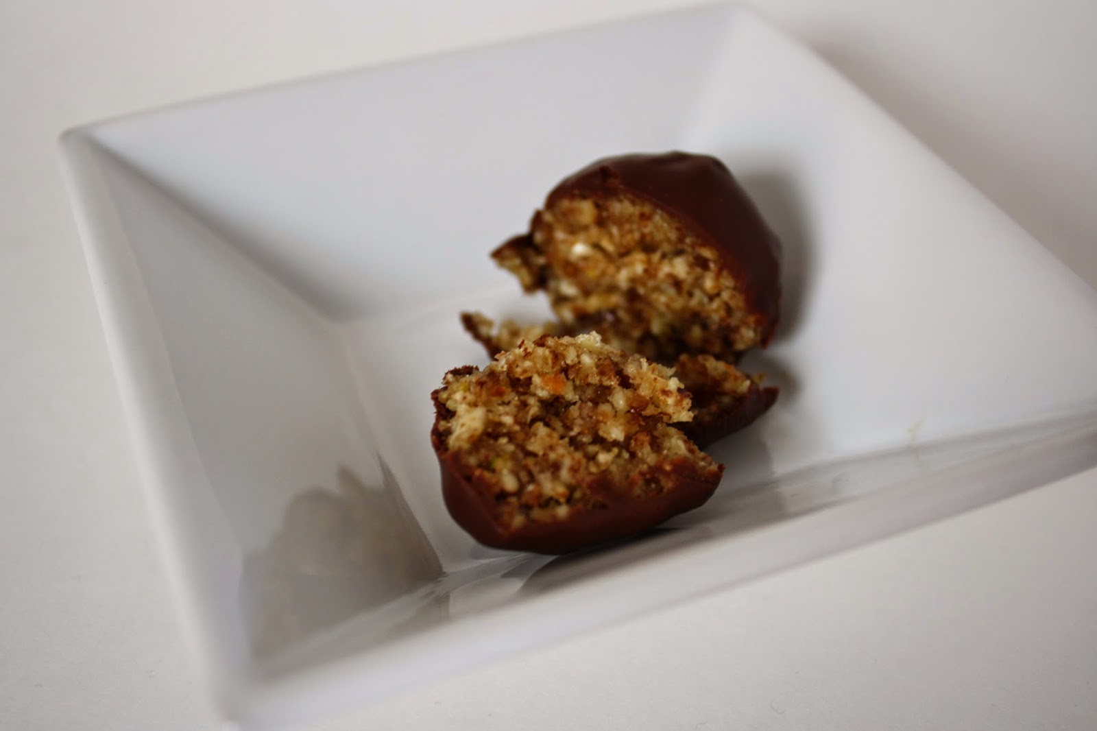 I got this recipe from Gluten-Free Girl. I initially chose it because it helped me use up a lot of nuts in my pantry, though I admit I used pecans instead of walnuts. I also increased the amount of chocolate and coconut milk for the ganache (though I still kept the proportions the same), and used chocolate that was closer to 60% cocoa than 70%. The Engineer and I loved having these in the fridge for a quick treat at various times during the day! This recipe yielded 20 balls for me.